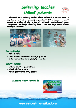 Absolventi kurzu Swimming teacher získajú skúsenosti s prácou s deťmi a dospelými pri odstraňovaní plaveckej negramotnosti . Cieľom kurzu je oboznámiť so správnou výučbová plávania v prípravnej, základnej a zdokonaľovacej etape, baby plávania, kondičnej a rekreačnej forme . Tento kurz nie je kurzom pripraví športových odborníkov .