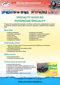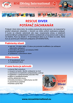Tento program vzdelávania RSI rekreačných potápačov je svojou metodikou a jednoduchosťou postavený pre vzdelávanie širokej skupiny milovníkov podvodného života. Bohaté medzinárodné skúsenosti inštruktorov z jednotlivých potápačských federácií, kvalitná metodika kurzov, bezpečnosť klientov radia tento výukový program medzi top svetové kurzy vzdelávania v oblasti potápania. Vstúpte do sveta rekreačného potápania lacno a bezpečne z profesionálnym tímom záchranárov.